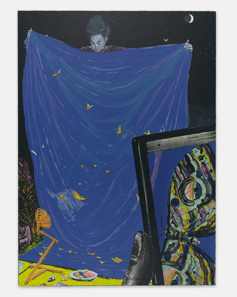 Paula Wilson (1975 – ) 來自於芝加哥,丹尼迪明畫廊與Wilson在香港首展《月球居民》的展覽上就曾經有過合作。她的作品時常包含人類與自然互動的主題,其靈感來源於她在新墨西哥州工作室裡的手工實踐、對昆蟲、植物動物的觀察和研究等。通過體會到真實觸感和想像歷史的啟發,Wilson用她的藝術作品創造了自己那野蠻與馴化相輔相成風格的民間傳說和神秘主義。 Wilson在本次展覽中展出的作品《Catching the Night》創作於2021年,作品中一位女性形象高舉著一個大毯子,以作為夜間活躍飛蛾和昆蟲的背景。作品的右下角,展示了一隻通過手機鏡頭捕捉到詳細特寫的飛蛾,展示了人類與自然互動的新時代。在這個時代,技術幫助人類給自然帶來了更多好奇和具有侵入性的交流。