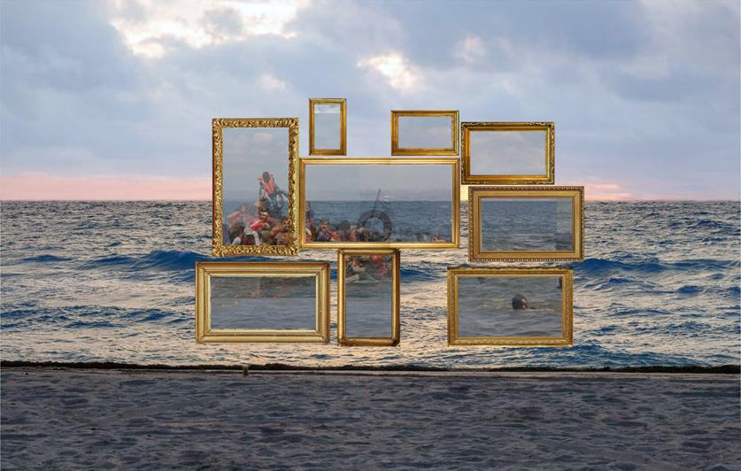 In the video, a continuous stream of boats crosses the split screens of the vast and dark ocean. The faces of the individuals draw closer to the viewer as people reach the shores. We witness in their faces and their actions, their courage, desperation, fear, loss, and hope. We see the various means of transport and escape reflecting the customs and traditions of their former homes: wooden boats, inflatables, hand-built rafts made out of anything that floats. But inside and around the crafts, we see the same desires and unknowns.