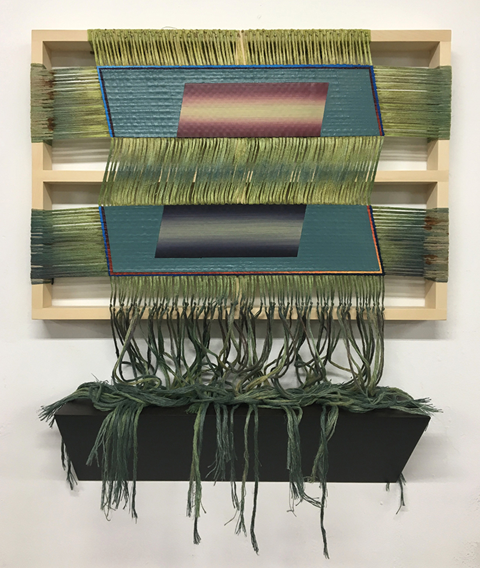 Seattle’s James Harris Gallery houses Brad Winchester’s “anti-painting” paintings, for which the artist tears apart linen surfaces, creating thin shreds of the material, almost gutting out its inner organs. Later, his healing process starts, weaving his threads into intricate forms to construct tactile alternates of paintings. Dying woven linen into bright colors, Winchester puts his painterly touch on the deconstructed and reborn material, which now lives between painting and sculpture, either tightly stretched into a wooden frame with tension or left draping with elegance.